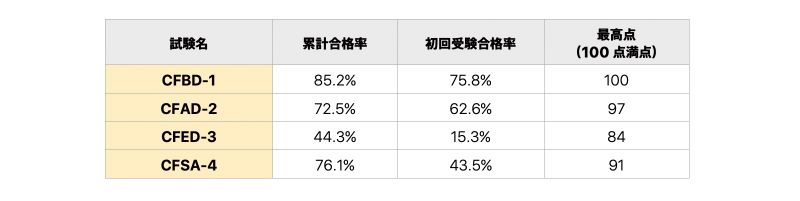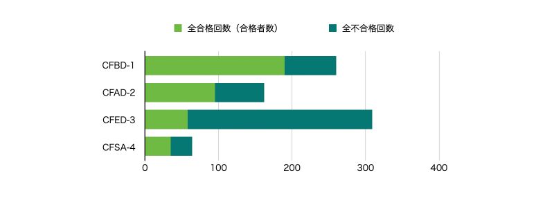 「累計合格率」の列についてはさまざまな見方があると思いますが、どの試験についても言えることは、初回受験で合格しなくても再チャレンジして合格している人が多くいるということですね。特に、CFED-3 と CFSA-4 は、その難易度の高さにかかわらず、最終的に合格されている人がたくさんいます。