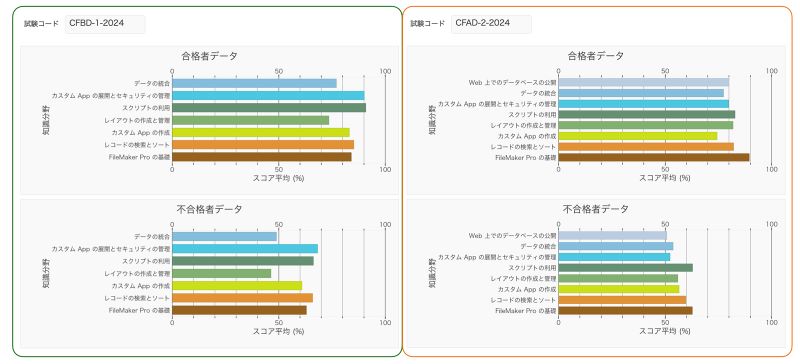 CFBD-1 (左側)の合格者スコア(上)と不合格者スコア(下)を比較してみると、不合格者の方は確かに全体的にスコアは低いのですが、特に知識分野「レイアウトの作成と管理」のスコアが低いようです。この知識分野は、FileMaker のレイアウトを構成するレイアウトパート、ポータルなどのさまざまなレイアウトツール、値一覧、スクリプトトリガなどに関するトピックが含まれている重要な知識分野です。このスコア平均が低いということから、Claris としては、この知識分野に関する学習リソースがわかりにくかったり、まとまっていなかったりするのではないかという反省ができます。
