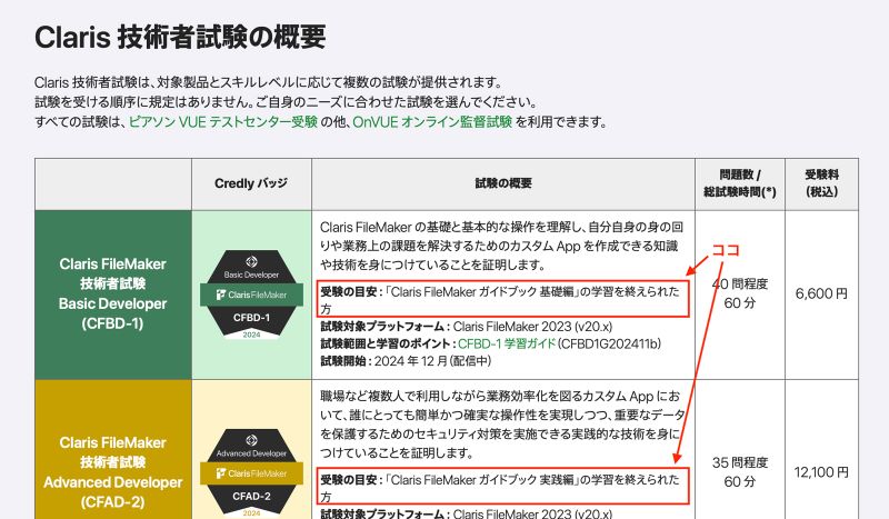 まず、Claris の公式サイトの「Claris 技術者試験の概要」の表には、各試験に対する「受験の目安」が明記されています。