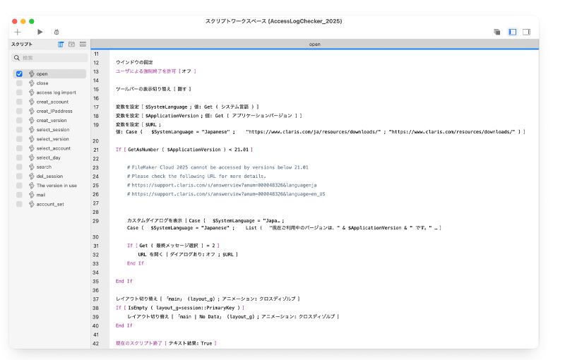 具体的にはサンプルファイル内にある「Open」スクリプトの一部をご確認ください。このスクリプト内で、バージョンが 21.0.1 未満の場合にカスタムダイアログを表示させています。