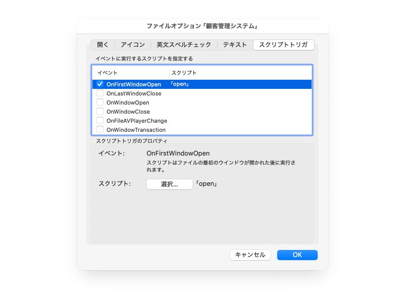 この「Open」スクリプトは FileMaker のメニューから、[ファイル] - [ファイルオプション] - [スクリプトトリガ] と選択し、「OnFirstWindowOpen」で指定しています。