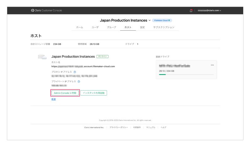 1. https://my.claris.com/ から Claris Customer Console に 登録された Claris ID で アクセスし、[ホスト] 内にある[Admin Console に移動] をクリックします。