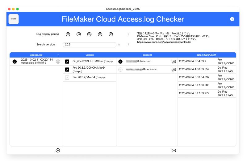 FileMaker Cloud 旧バージョン利用者の検出一覧画面