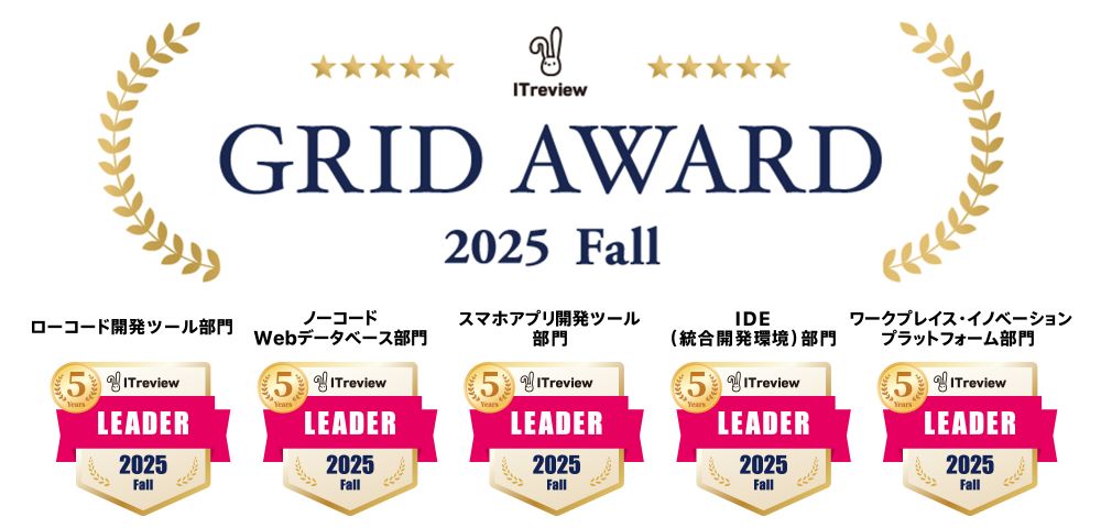 ユーザのリアルな声をもとに製品を比較できる、ビジネス向け IT 製品・クラウドサービスのレビュープラットフォーム「ITreview (アイティレビュー)」 (提供:アイティクラウド株式会社) が、ITreview Grid Award 2025 Fall を発表しました。Claris FileMaker は、前回 (ITreview Grid Award 2025 Summer) に引き続き、ローコード開発ツール部門を含む 5 部門で「Leader」 に選出されました。これもひとえに、Claris FileMaker をご愛顧いただいているみなさまに貴重なレビューをお寄せいただいたおかげです。心より感謝申し上げます。