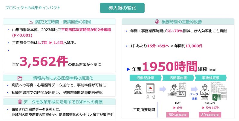 この取り組みは救急搬送プロセスにおける効果の他に、山形市の医療政策にも影響をもたらした。NSER mobile の活用により傷病者の年齢や症状、搬送時間、応需状況などのデータがリアルタイムに蓄積されるようになり、エビデンスに基づく政策立案(EBPM)が可能になったという。