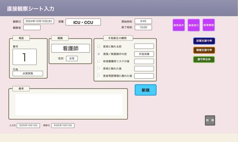 手始めに作成した「手指衛生サーベイランス 観察集計」画面