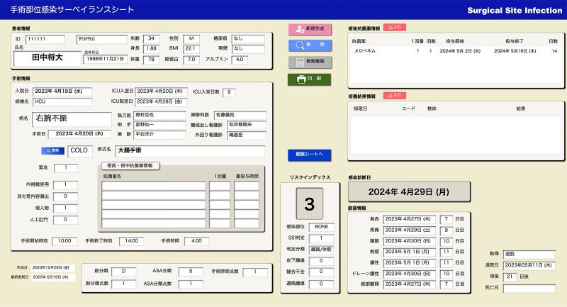 患者情報や手術情報、抗菌薬使用状況などを1画面で記録・管理する「手術部位感染サーベイランスシート」