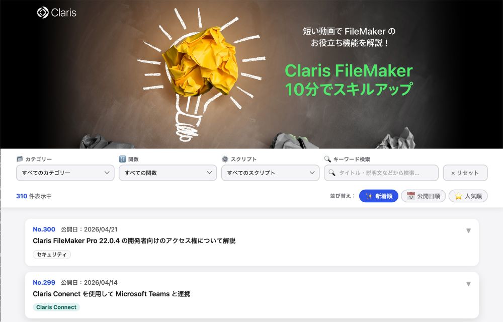 10 分でスキルアップ、本編動画は 300本ですが、それとは別に FileMaker に AI をどう組み込んで活用していくかをレクチャーした「AI シリーズ」も展開しています。こちらを含めると 310本の動画、つまり約 310個のお役立ち Tips が無料で、そしてわかりやすい説明とともに見られるということなんです。ぜひ、存分にご活用ください。AI シリーズにつきましても、これからどんどんアップしていきますのでご期待ください!