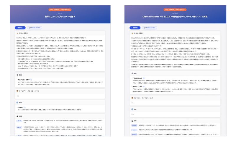 ここで、「Claris FileMaker 10 分でスキルアップ」をご存知ない方にご紹介させていただくと、先述のとおり、 FileMaker でできる便利技をレクチャーする動画です。1つの動画につき 10分ほどでさまざま機能の実装の仕方やどういう場面でその機能が使えるかなどを紹介しています。そしてそれらの動画をまとめた Claris サイト内の「まとめページ」では、使っている機能をカテゴリ分けして検索できるようにしています。知りたいことがピンポイントで調べられ、また短時間で学べるので、初心者の方からプロの開発者の方まで、多くのユーザのみなさまに参考にしていただいています。