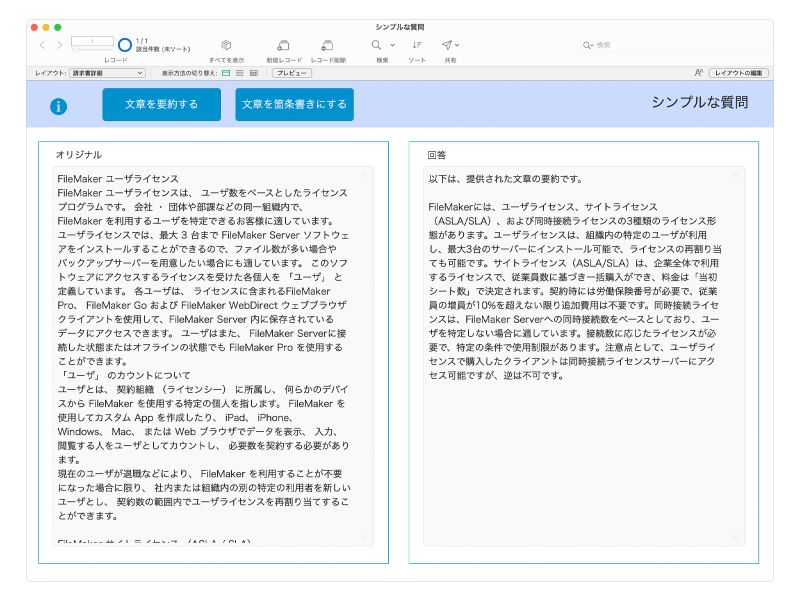 Claris FileMaker Pro のスクリプトが AI をサポートしたことで、こんなにシンプルなスクリプトを作るだけで要約が実行できるようになりました。iPhone や iPad でも、Claris FileMaker Go を使って同様に実行できます。
