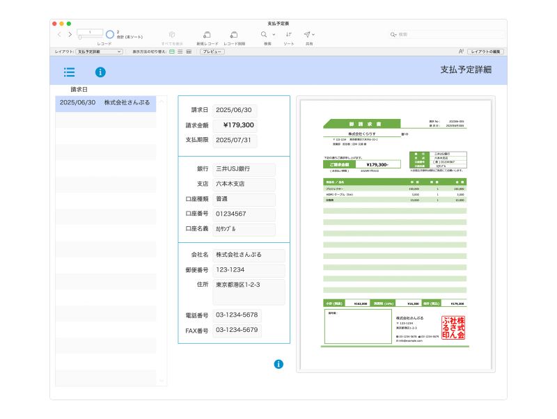 仕入れ先からの請求書を PDF ファイルで受け取るケースも多くあると思います。そこで、[モデルから応答を生成] スクリプトステップを使って、請求書の PDF ファイルを取り込んで支払予定表を作成できれば、期日までに忘れずに支払いを行えます。最後の例では、そんな活用シナリオを取り上げます。