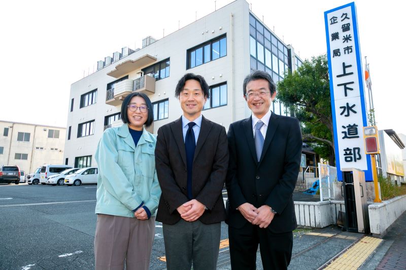 (左から)久留米市企業局 上下水道部営業管理課 主任主事 三海 奈穂子氏、坂東 孟氏、課長補佐 上河 達郎氏