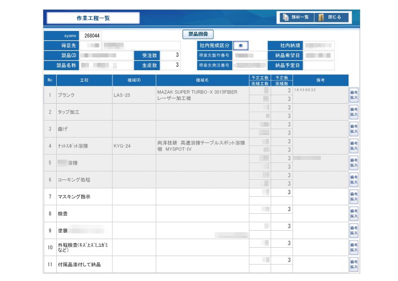 作業工程を管理する画面。終了した作業はグレーアウトし、進捗状況がひと目で確認できる