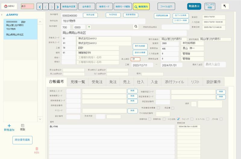 システムの中心となるのは、年間約 1 万 5,000 件に及ぶ案件情報を管理する「物件台帳」だ。ここから見積書、受発注、売上、仕入れといった関連情報がすべて紐づけられている。旧システムでは画面遷移が煩雑だったが、新システムではタブ形式を採用し、関連情報へスムーズにアクセスできるようになった。